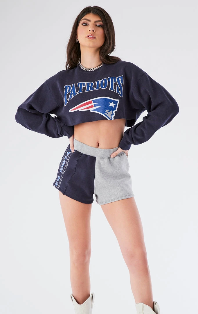 This one-of-a-kind set was reworked by Furst of a Kind from a vintage New England Patriots sweatshirt. Redesigned into a two piece set featuring a cropped sweatshirt paired with a spliced sweatshirt short.Â