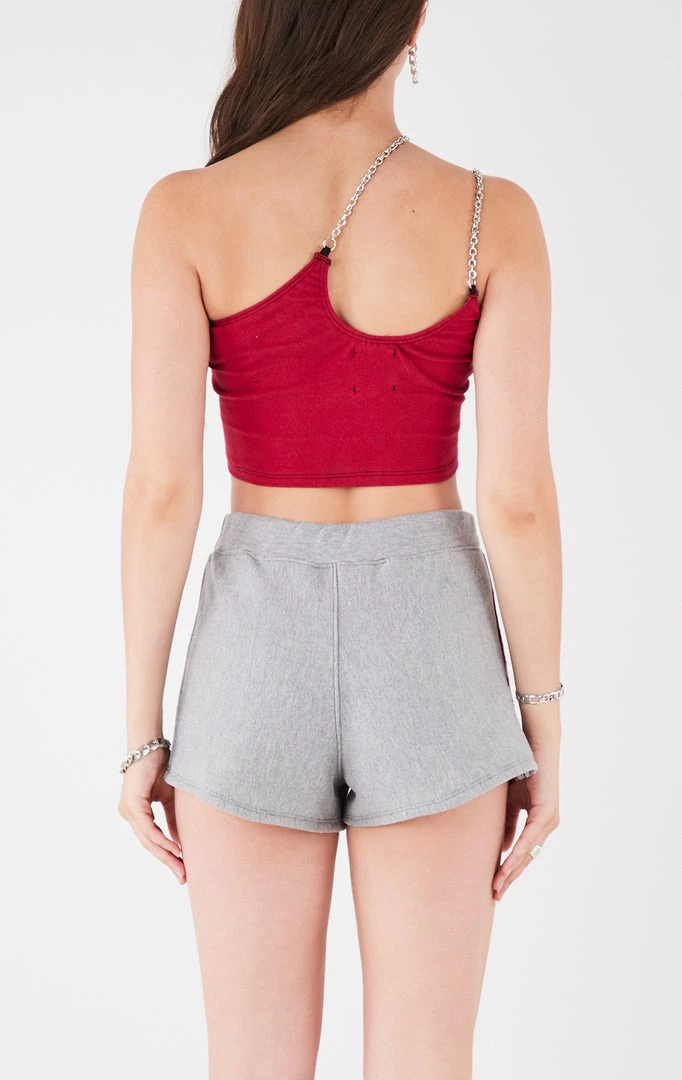 Furst of a Kind took a vintage University of Alabama tee and reworked it into a two-piece set. This set is complete with a one-shoulder double chain tank top and spliced shorts.