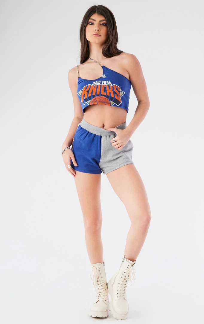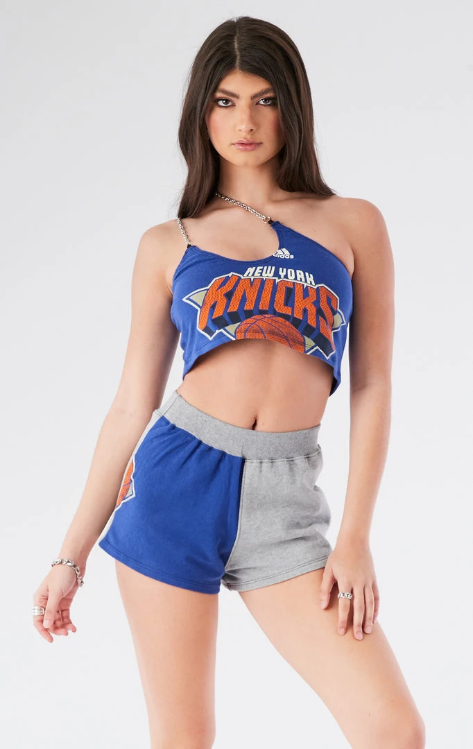 Furst of a Kind took a vintage New York Knicks tee and reworked it into a two-piece set. This set is complete with a one-shoulder double chain tank top and spliced shorts.