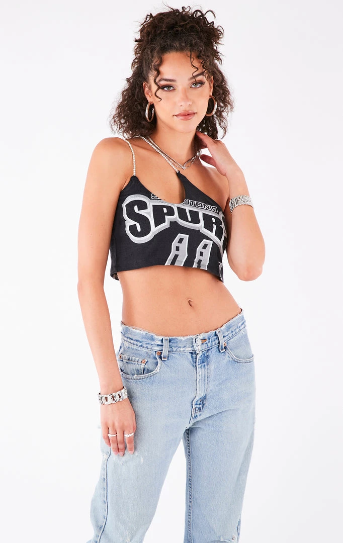 Furst of a Kind took this vintage San Antonio Spurs tee and reworked it into a priceless gem. This tank is complete with a one-shoulder cut out, cropped hem and double rhinestone chain straps.