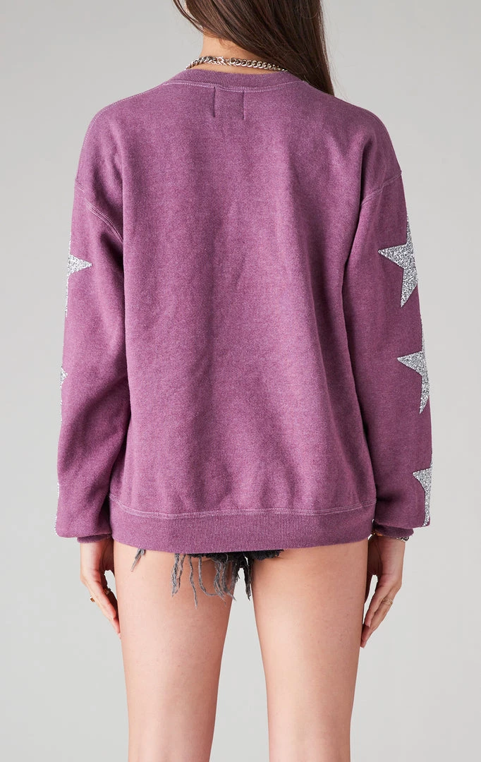 Put your thing down flip it and rework it. Furst of a kind made their mark on this vintage Boston Red Sox sweatshirt with a fresh purple overdye process. How could we be even more obsessed? Add silver rhinestone star patches to the sleeves, that’s how. Done and done.