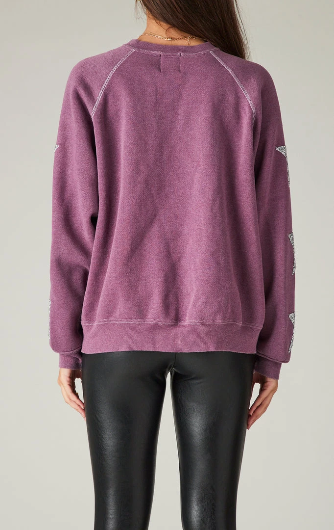 Put your thing down flip it and rework it. Furst of a kind made their mark on this vintage Penn State University sweatshirt with a fresh purple overdye process. How could we be even more obsessed? Add silver rhinestone star patches to the sleeves, that’s how. Done and done.