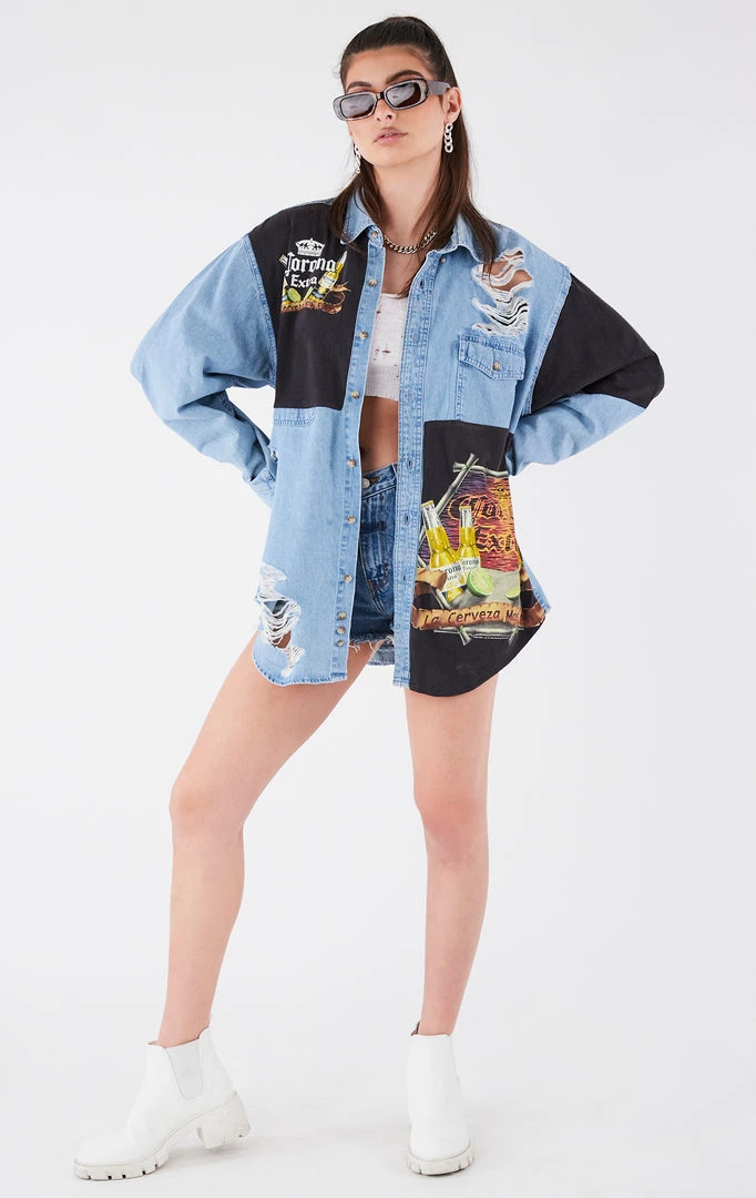 Furst of a Kind reworked this vintage chambray. Hand sourced, sewn & spliced in Los Angeles. Features patchwork from a vintage Corona tee.