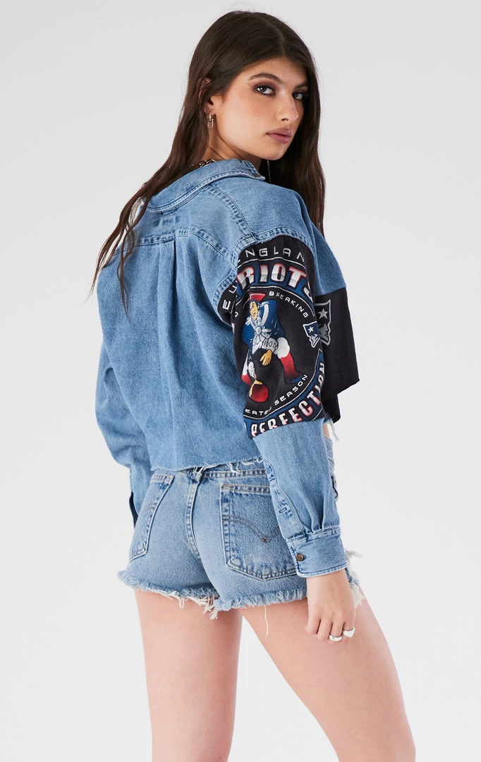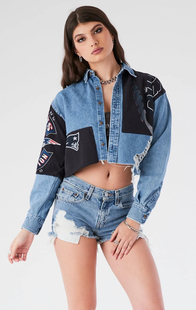Furst of a Kind reworked this vintage chambray. Hand sourced, sewn & spliced, this vintage New England Patriots patchwork chambray is complete with a cropped cut and snap closure.