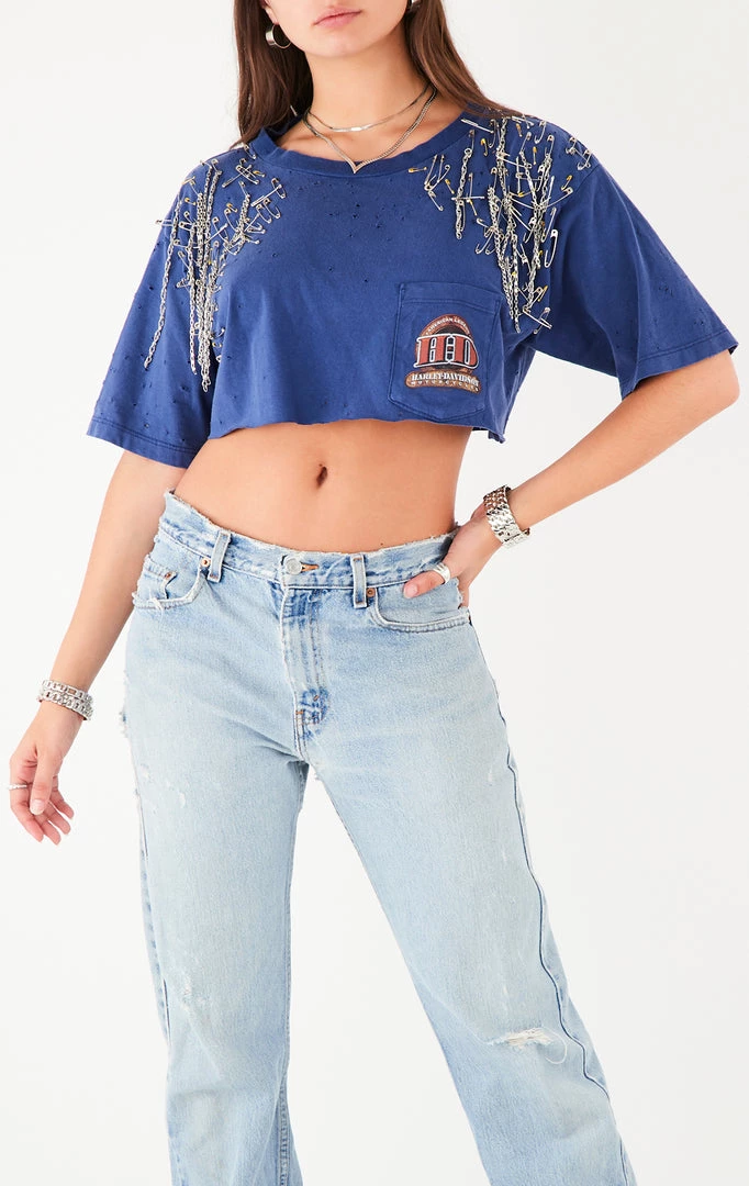 This one-a-kind vintage Harley Davidson tee was reworked by Furst of a Kind. Features a stonewash technique and safety pin and chain embellishment.