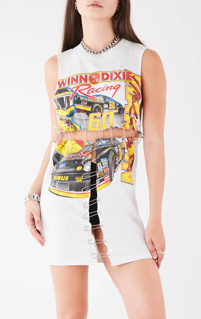 This vintage Nascar tee was sourced and reworked by Furst of a Kind with a dramatic sleeveless cut and safety pin ladder.