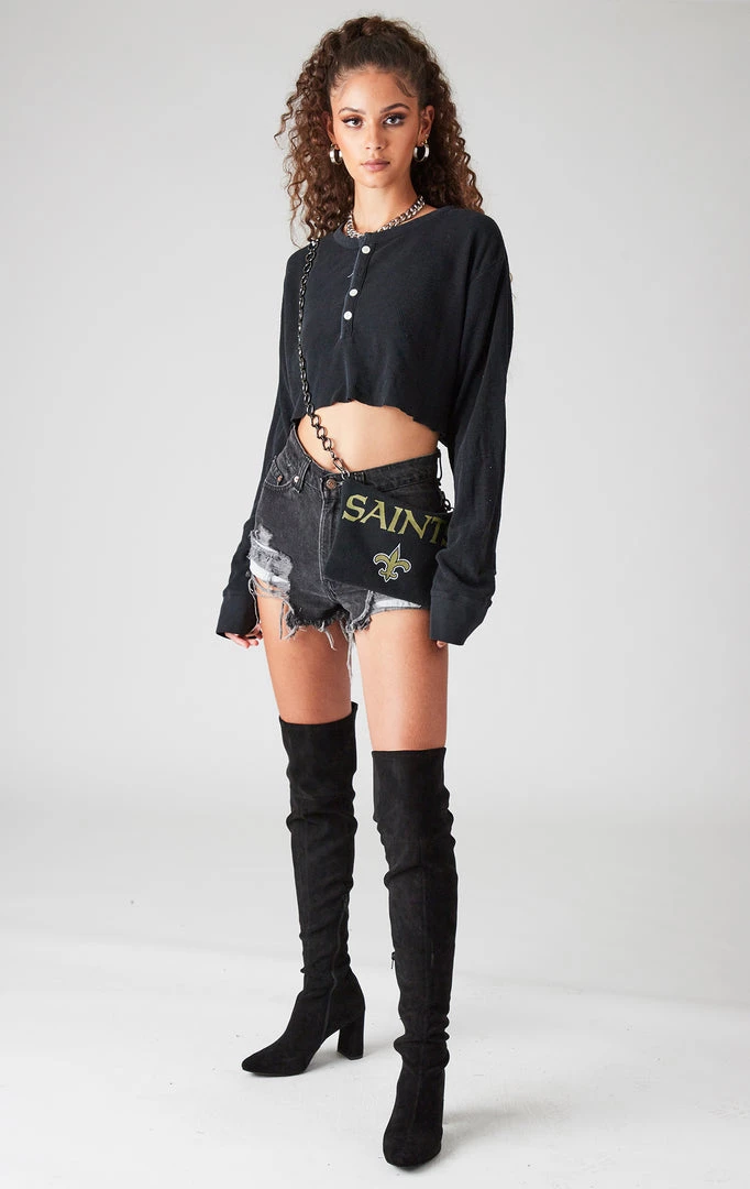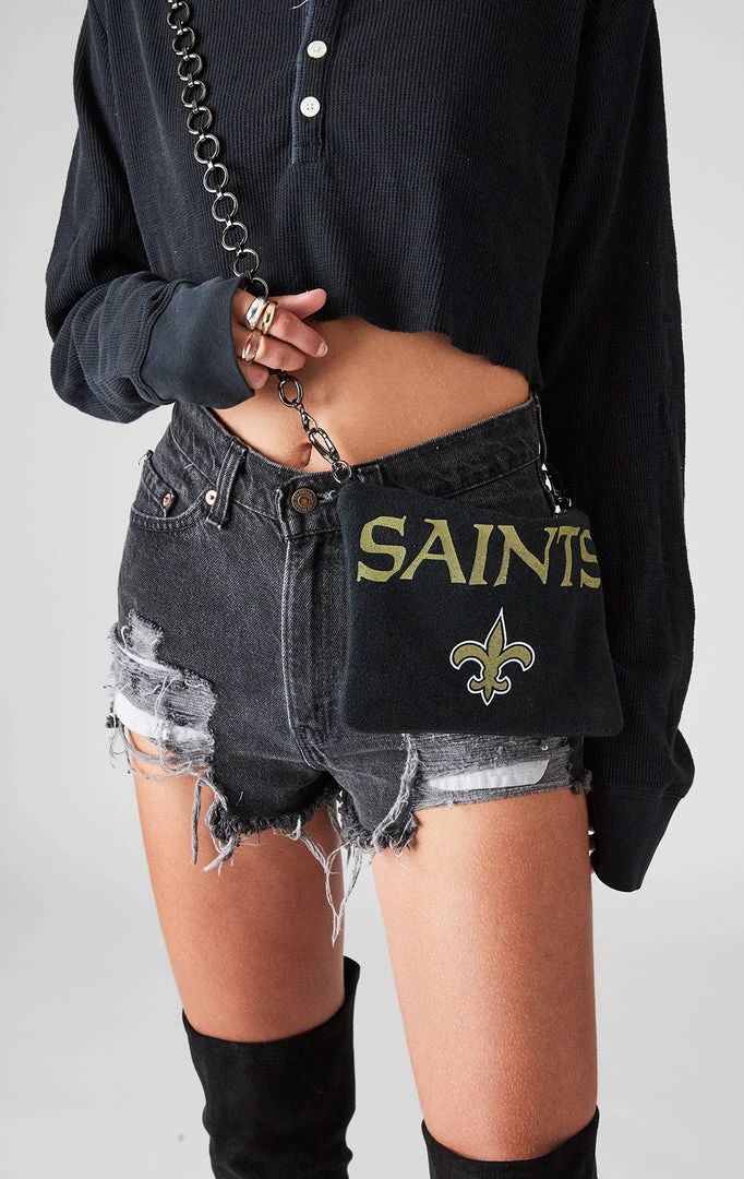 Just throw it in the bag. This one of a kind vintage sweatshirt purse is the cherry on top of your reworked vintage collection. Furst of a Kind upcycled a vintage New Orleans Saints sweatshirt, turning it into the perfect every day handbag to rep your school no matter the occasion. Featuring a gunmetal ring strap, zipper closure and flannel lining with endless styling options. Wear it as a purse or as a waist bag.