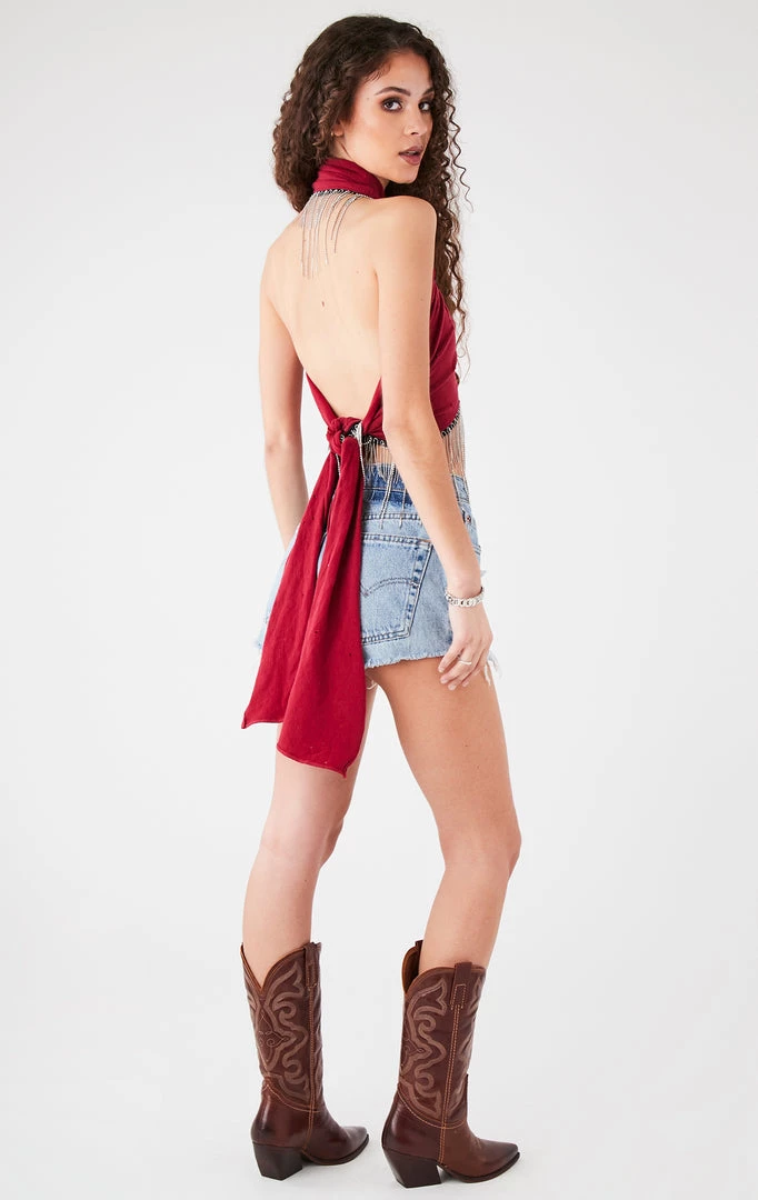 Furst of a Kind created the perfect halter wrap top. This top was reworked from a vintage Florida State University tee and features rhinestone fringe detailing. Cross this vintage wrap around your neck and finish it off with a tie in the back to create the perfect halter top.