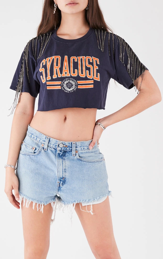This one-a-kind vintage Syracuse University tee was reworked by Furst of a Kind. Upcycled with a stonewash technique, cropped cut and rhinestone fringe on the sleeves.