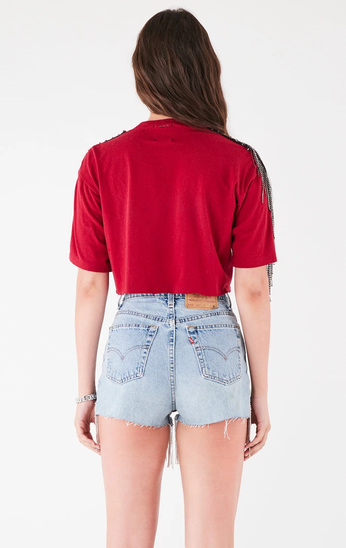 This one-a-kind vintage University of Alabama tee was reworked by Furst of a Kind. Upcycled with a stonewash technique, cropped cut and rhinestone fringe on the sleeves.