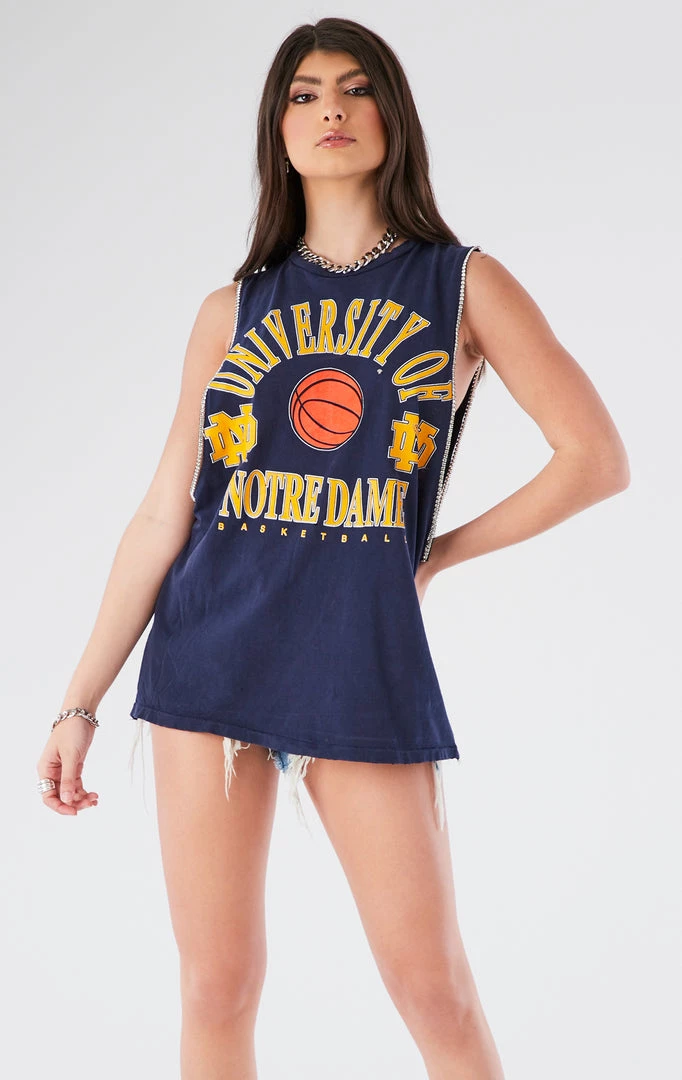 This vintage University of Notre Dame tee was sourced and reworked in Los Angeles by Furst of a Kind with a dramatic sleeveless cut and lined with rhinestone trim.