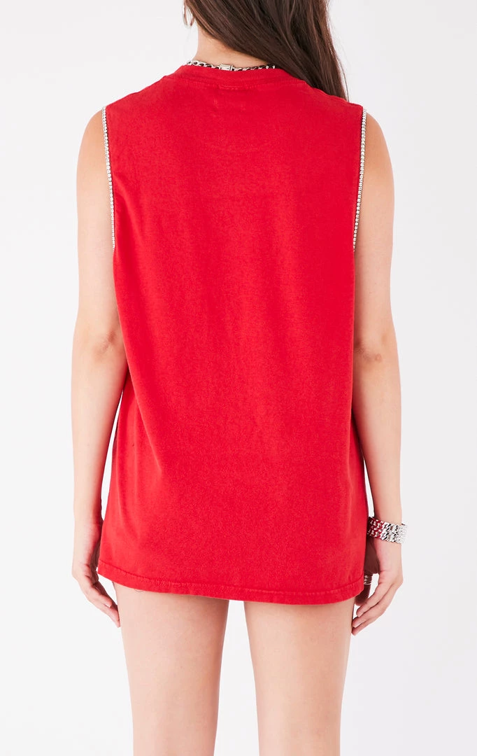 This vintage University of Wisconsin tee was sourced and reworked in Los Angeles by Furst of a Kind with a dramatic sleeveless cut and lined with rhinestone trim.