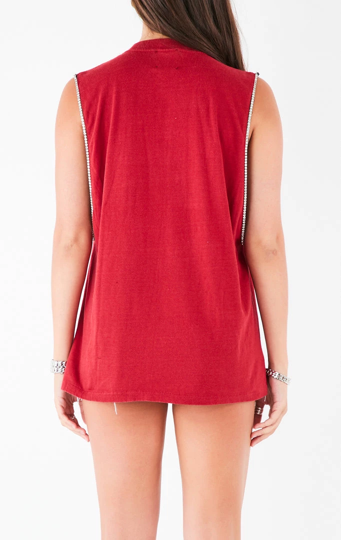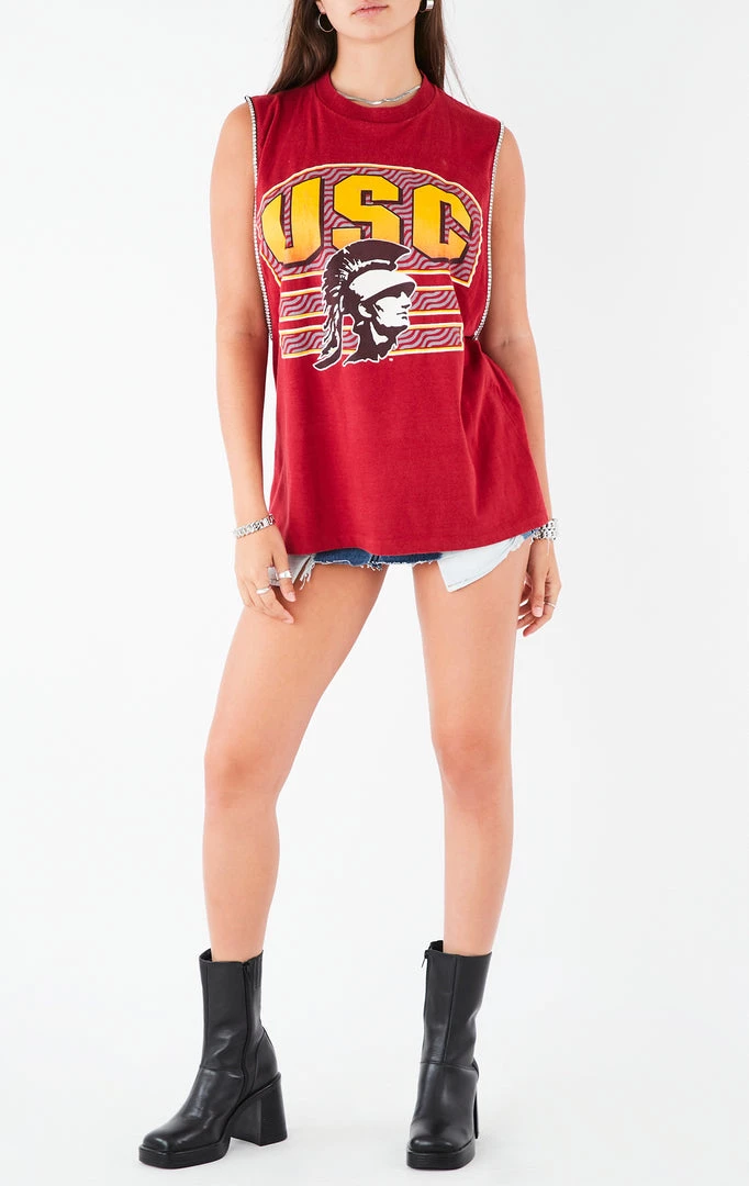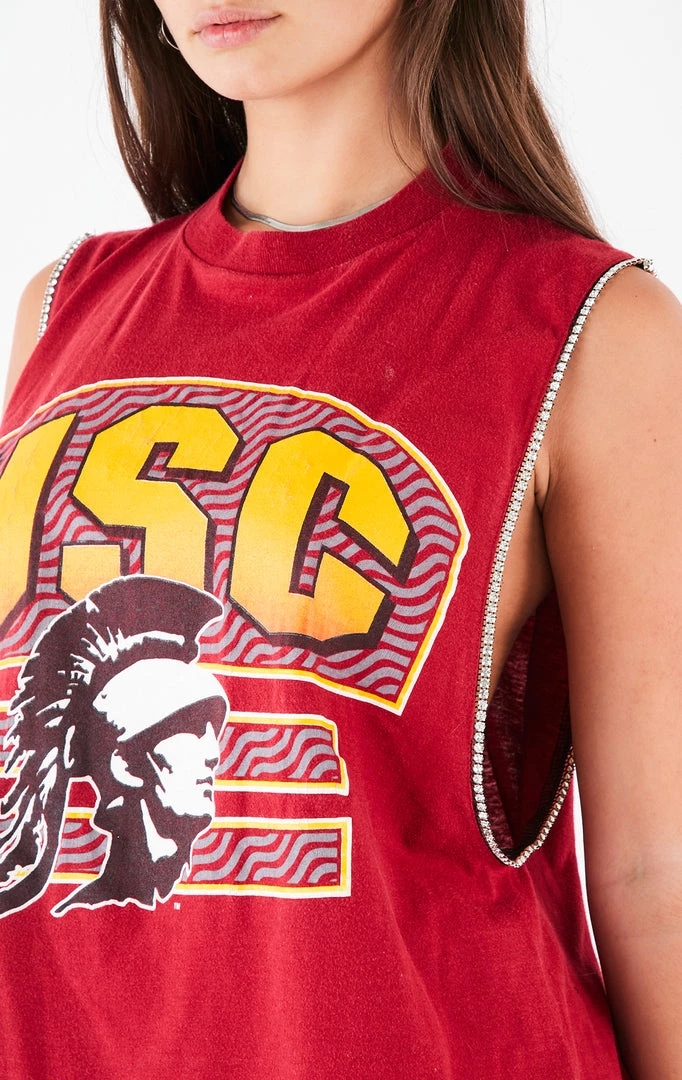 This vintage USC tee was sourced and reworked in Los Angeles by Furst of a Kind with a dramatic sleeveless cut and lined with rhinestone trim.