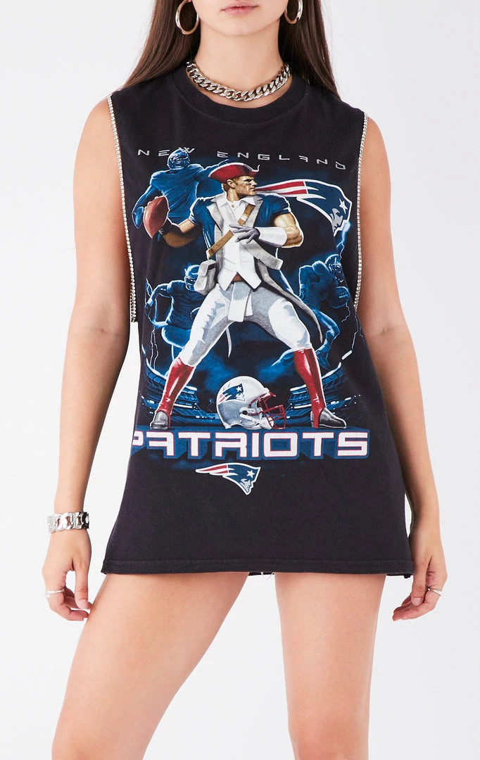 This vintage New England Patriots tee was sourced and reworked by Furst of a Kind. FeaturesĀ a dramatic sleeveless cut and rhinestoneĀ trim.Ā