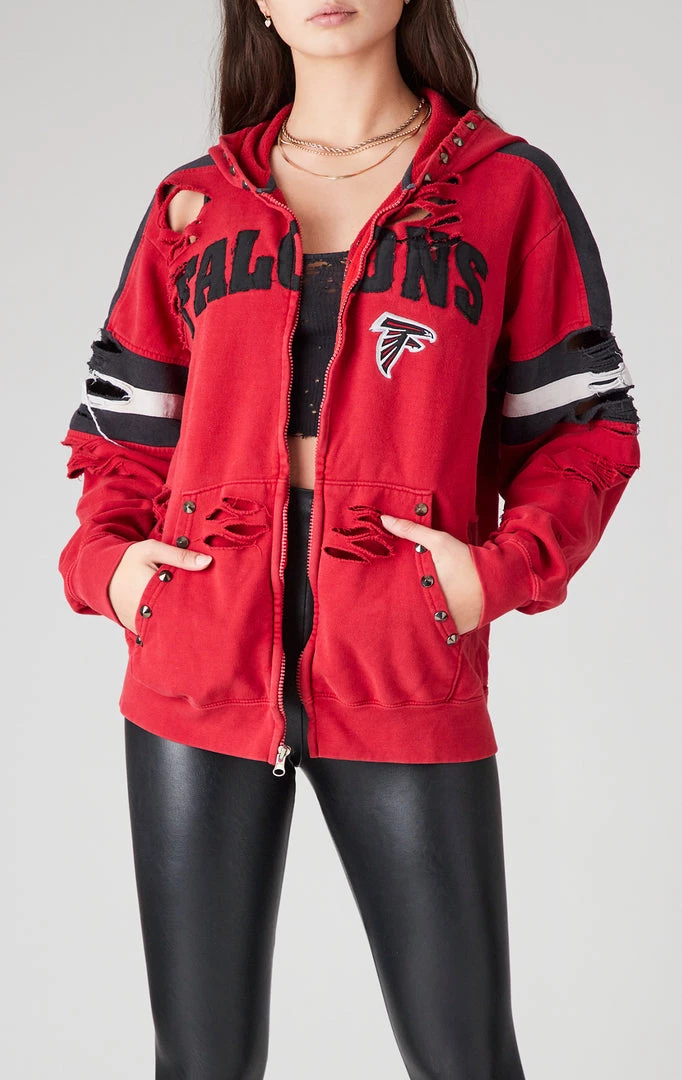 This vintageĀ Atlanta FalconsĀ zip up hoodie will add some major edge to your look. This vintage hooded sweatshirt was sourced by Furst of a Kind. It features shredding throughout and hand studded embellishment on the hood and front pockets.