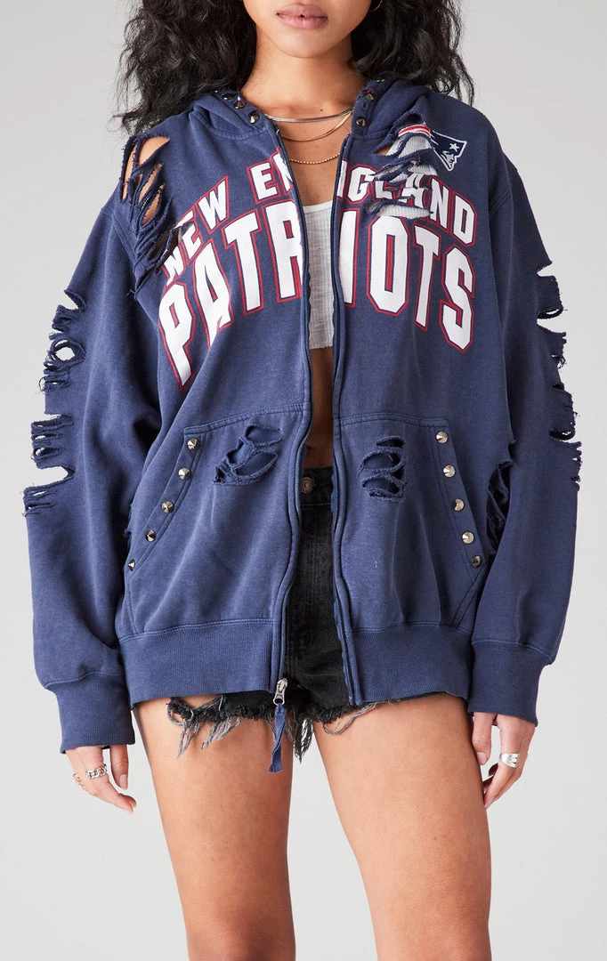 This vintage New England Patriots zip up hoodie will add some major edge to your look. This vintage hooded sweatshirt was sourced by Furst of a Kind. It features shredding throughout and hand studded embellishment on the hood and front pockets.