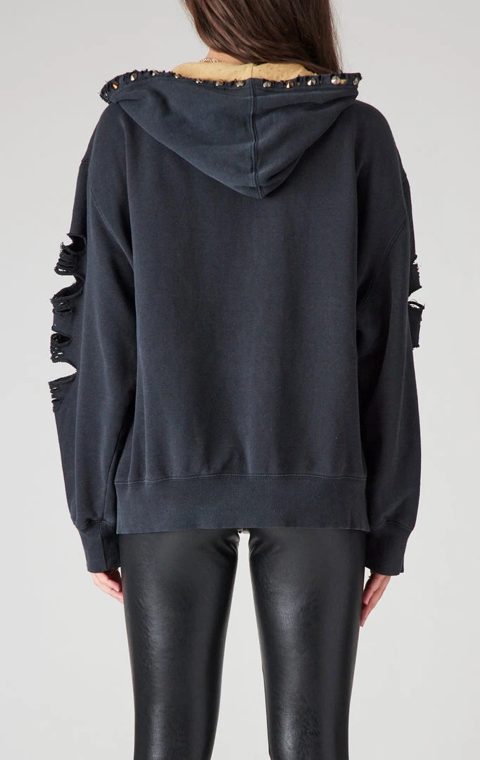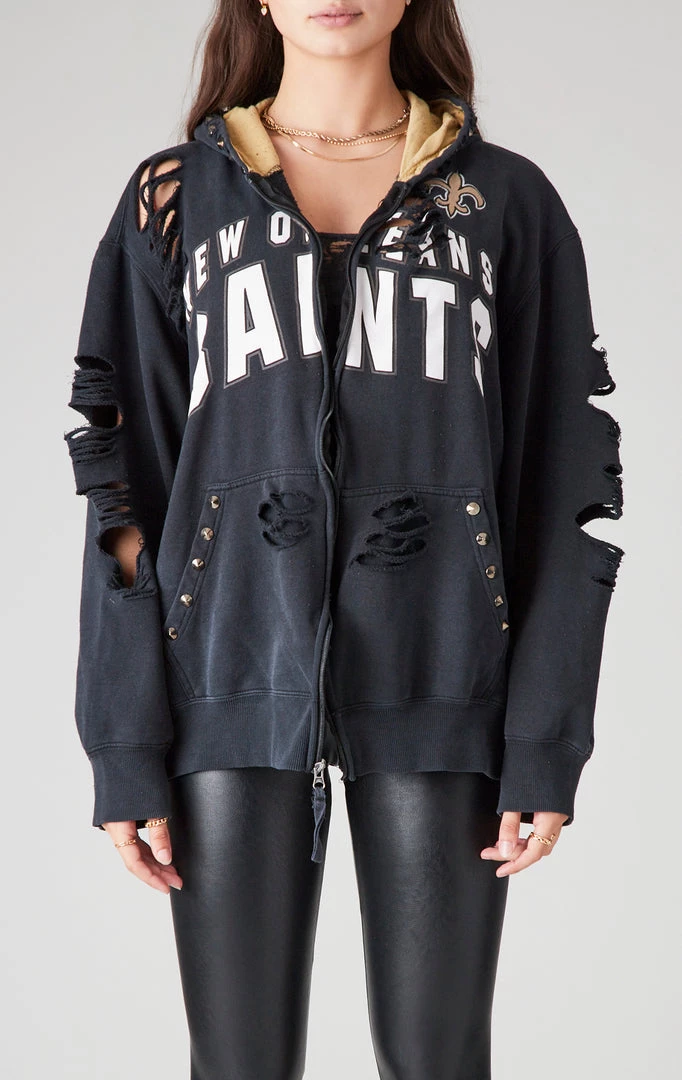 This vintage New Orleans Saints zip up hoodie will add some major edge to your look. This vintage hooded sweatshirt was sourced by Furst of a Kind. It features shredding throughout and hand studded embellishment on the hood and front pockets.
