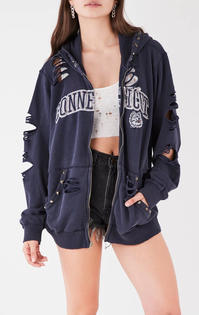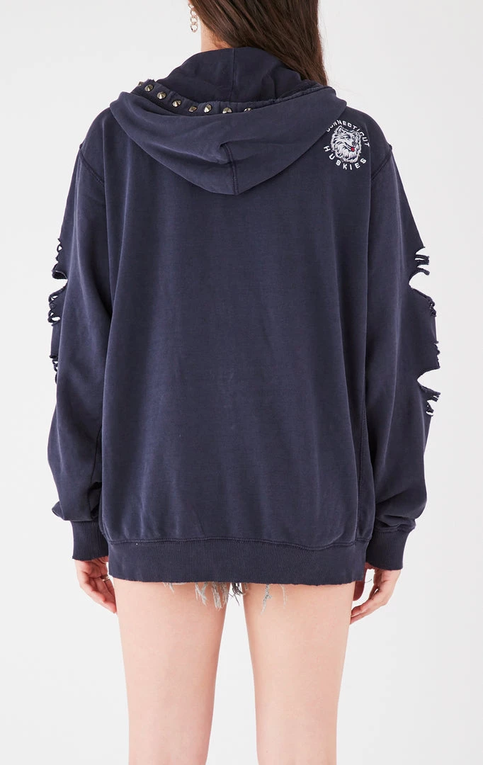 This vintage University of Connecticut zip up hoodie will add some major edge to your look. This vintage hooded sweatshirt was sourced by Furst of a Kind. It features shredding throughout and hand studded embellishment on the hood and front pockets.