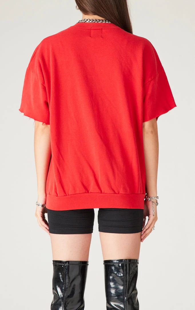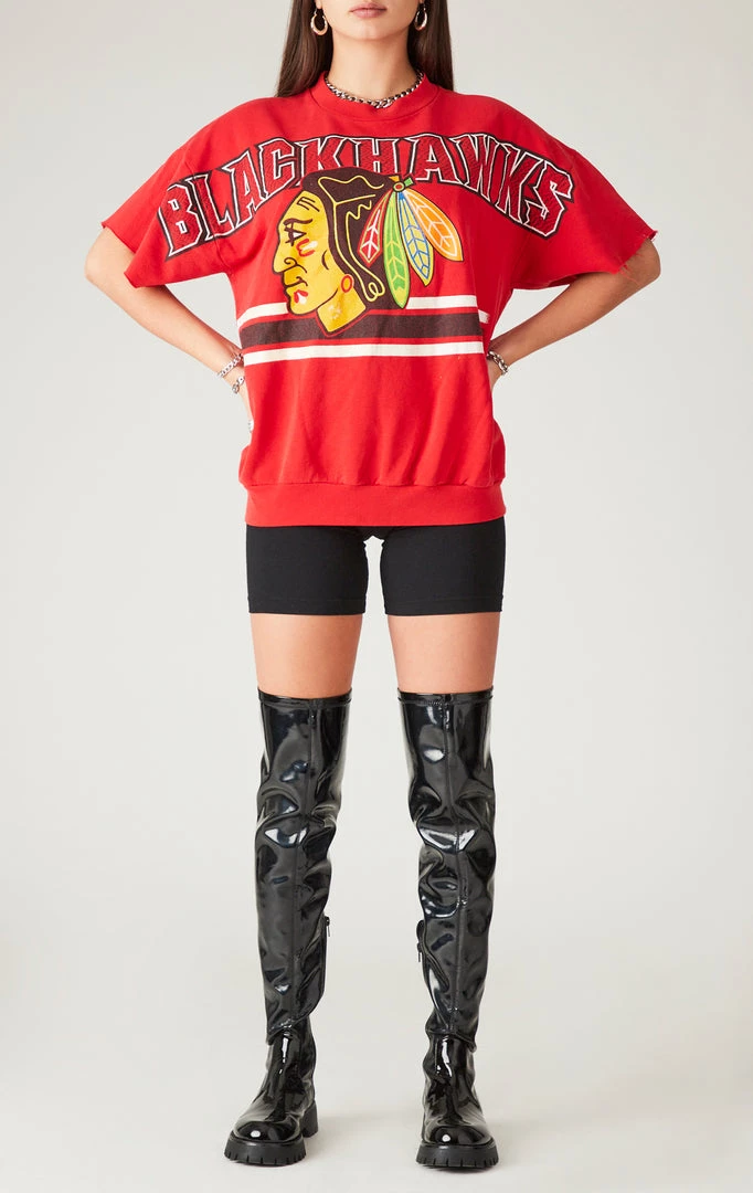 For the days when you wanna be comfy & cute, but also keep it cool. This reworked one of a kind vintage Chicago Blackhawks sweatshirt is the perfect piece. You can never have enough oversized sweatshirts, but the cut-off short sleeves add a fresh new element to your collection. You’ll get that worn in vintage feel and comfort without all the heat.