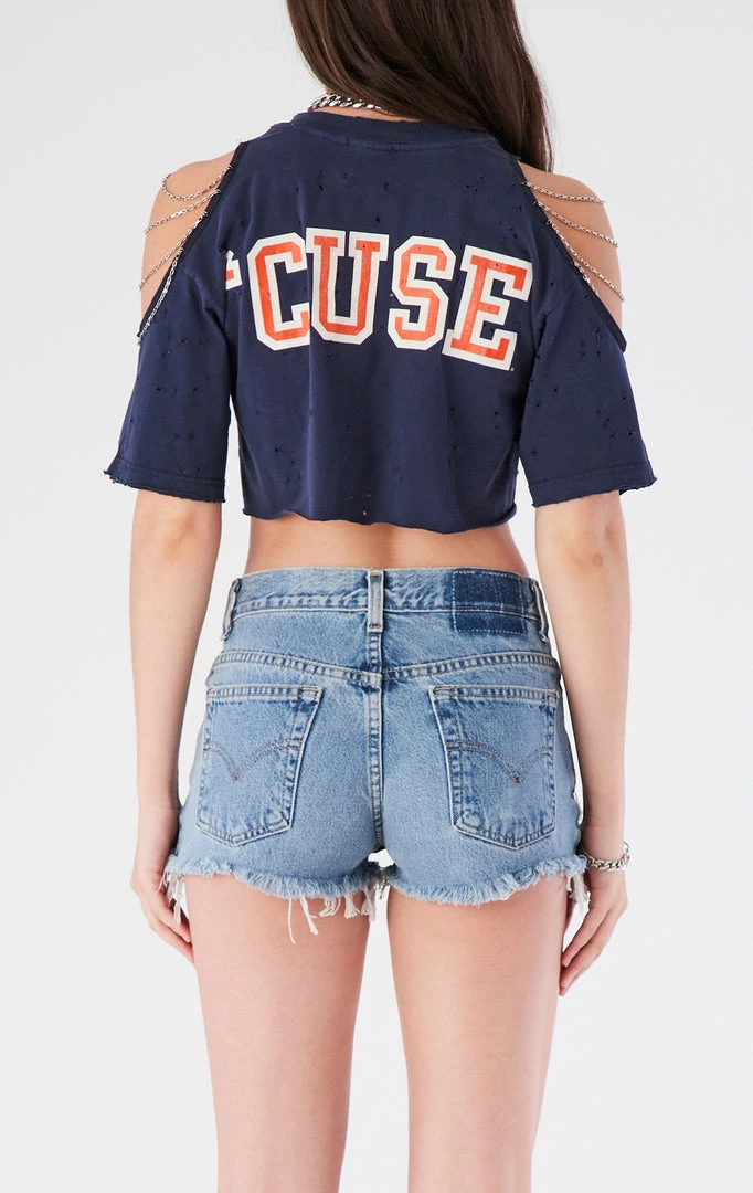 Furst of a Kind created a whole new attitude with this vintage Syracuse University tee. Reworked with a stonewash technique, cropped length and cut out shoulder detailing that is draped in silver chains.