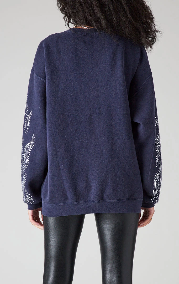 Straight FIRE. This vintage University of Illinois sweatshirt is almost too hot to handle. Furst of a Kind reworked this college sweatshirt with silver rhinestone flame embellishment on both sleeves. The sickest sustainable addition to your vintage collection. That’s hot.