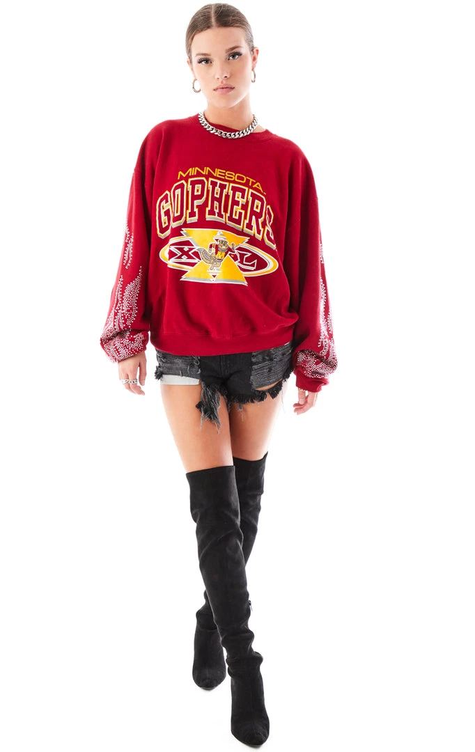 Straight FIRE. This vintage University of Minnesota sweatshirt is almost too hot to handle. Furst of a Kind reworked this college sweatshirt with silver rhinestone flame embellishment on both sleeves. The sickest sustainable addition to your vintage collection. That’s hot.