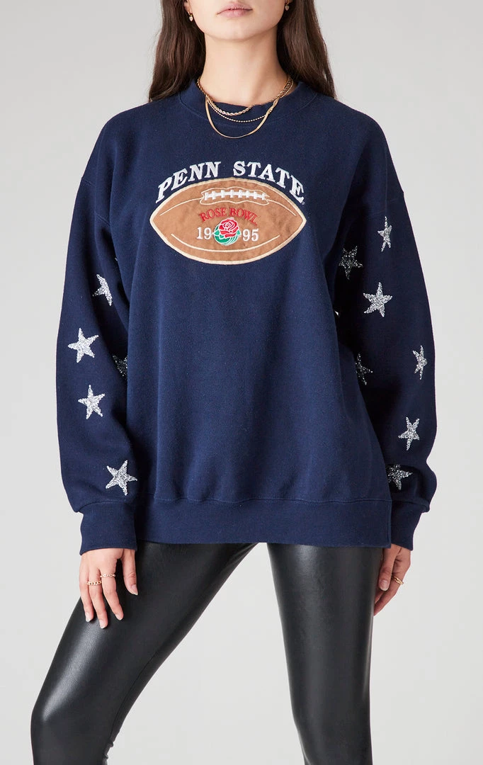 This vintage sweatshirt is taking star patches to the next level. Furst of a Kind reworked this vintage Penn State University sweatshirt with mini rhinestone star patch embellishment sprinkled on the sleeves. It’s all in the details.