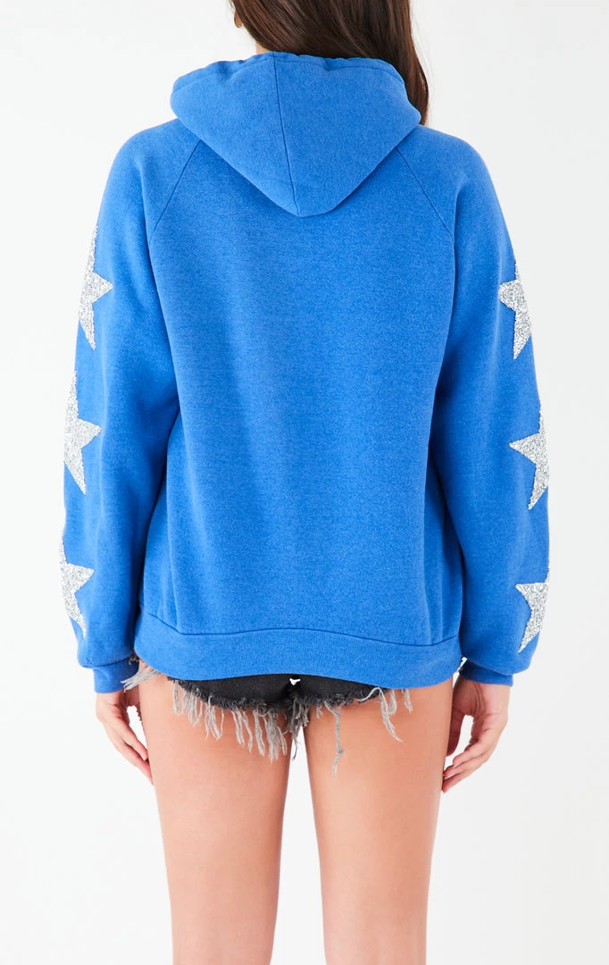 Upcycled from a vintage New York Rangers hoodie. Furst of a Kind reworked this vintage hoodie with silver star patch embellishment down both sleeves.