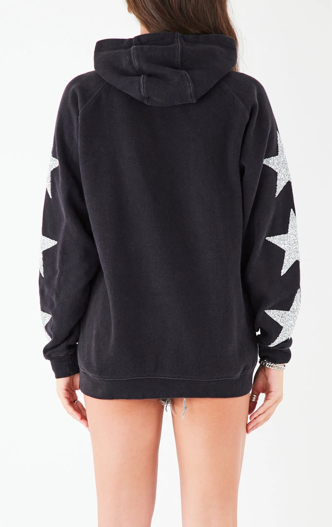 Upcycled from a vintage San Francisco 49ers hoodie. Furst of a Kind reworked this vintage hoodie with silver star patch embellishment down both sleeves.