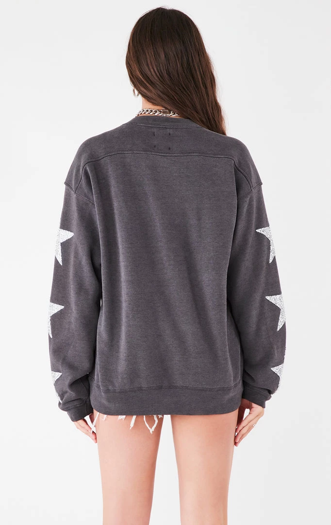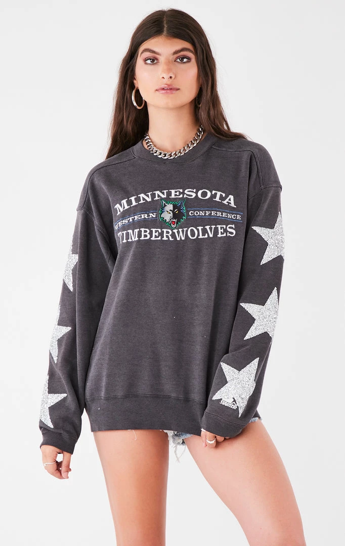 Upcycled from a vintage Minnesota Timberwolves sweatshirt. Furst of a Kind reworked this sweatshirt with silver star patch embellishment down both sleeves.