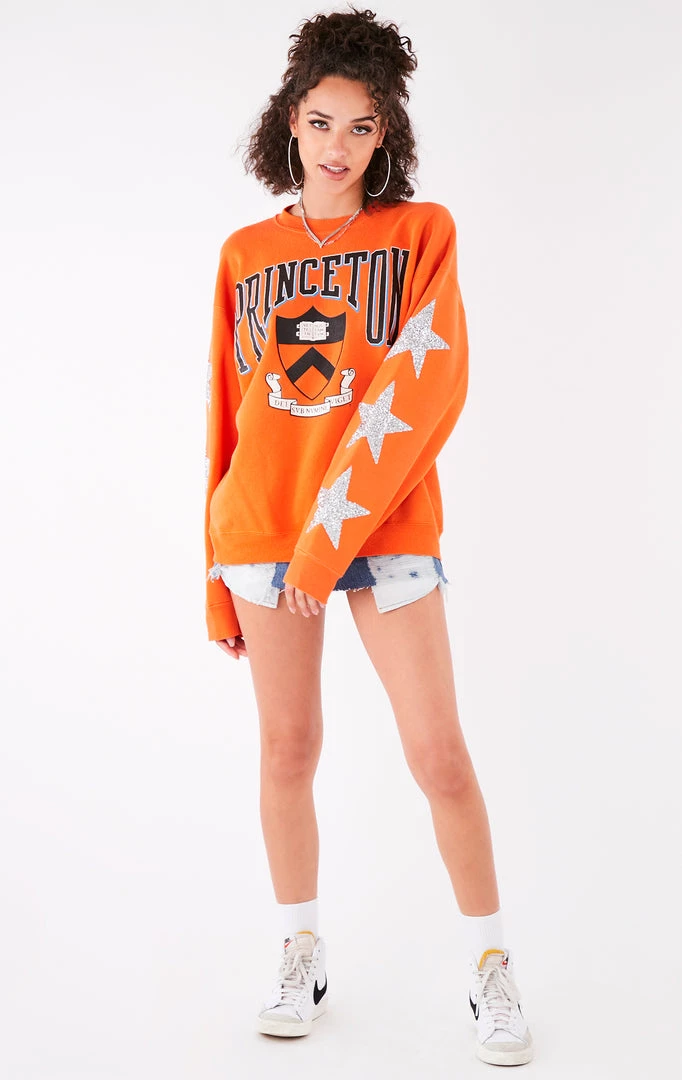 Upcycled from a vintage Princeton University sweatshirt. Furst of a Kind reworked this vintage college sweatshirt with silver star patch embellishment down both sleeves.