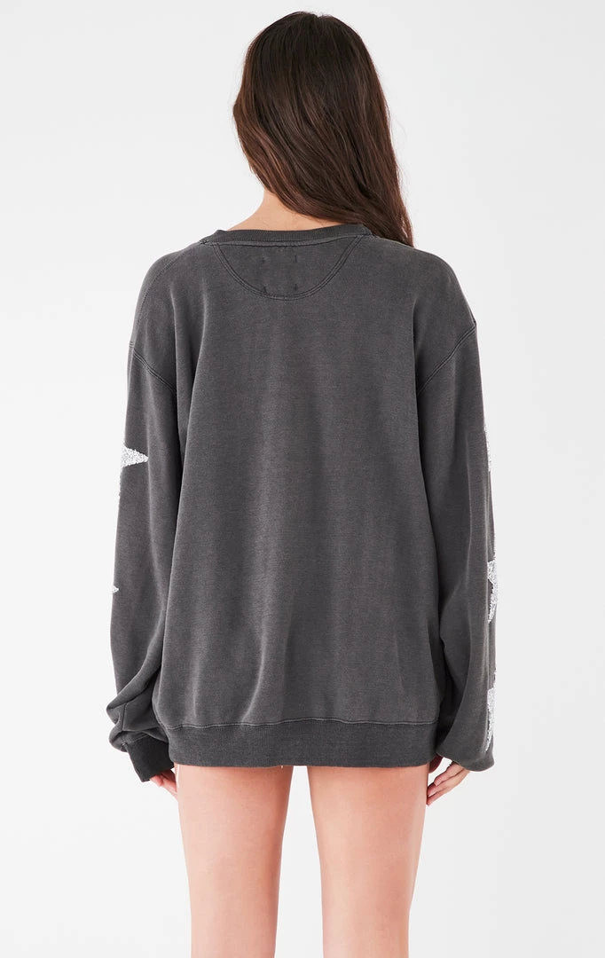 Upcycled from a vintage Purdue University sweatshirt. Furst of a Kind reworked this vintage college sweatshirt with silver star patch embellishment down both sleeves.