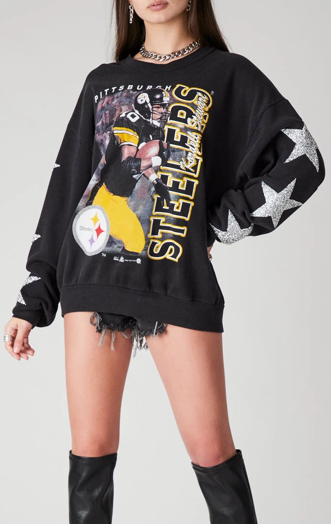Upcycled from a vintage Pittsburgh Steelers sweatshirt. Furst of a Kind reworked this college sweatshirt with silver star patch embellishment down both sleeves.