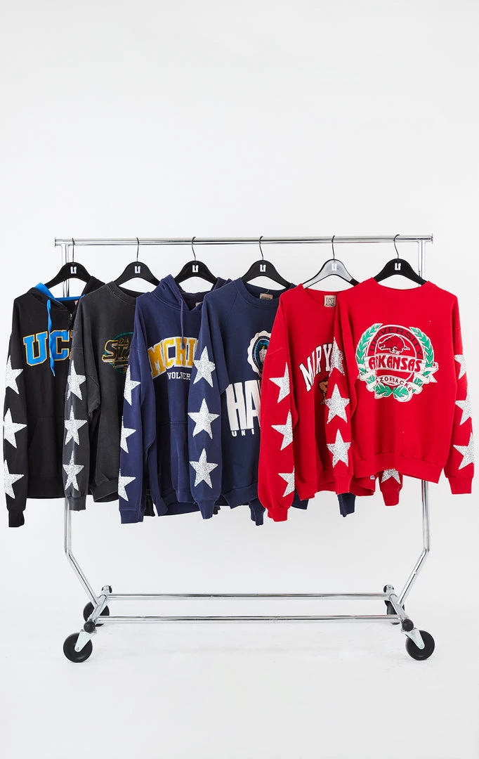 Upcycled from a vintage sweatshirt Furst of a Kind reworked this sweatshirt with silver star patch embellishment down both sleeves.