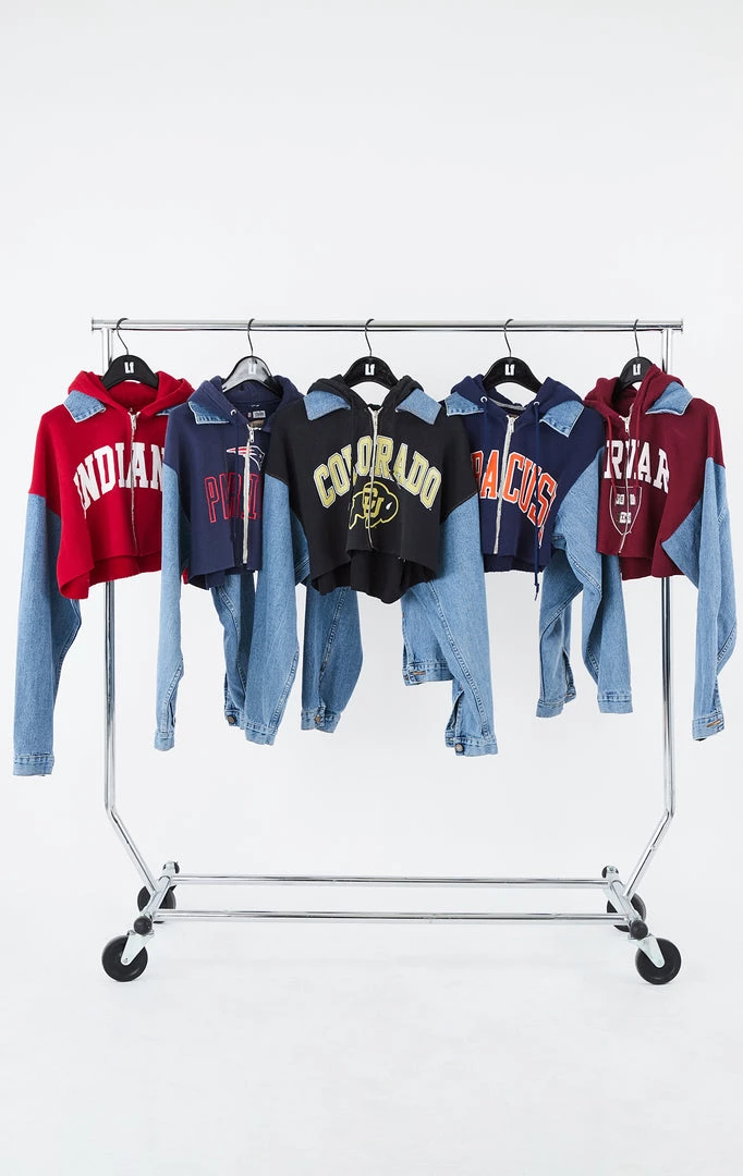 Furst of a Kind reworked this denim jacket, splicing it together with a vintage hooded sweatshirt. Complete with denim collar and zipper closure.