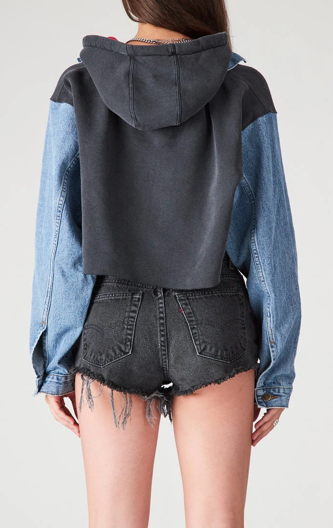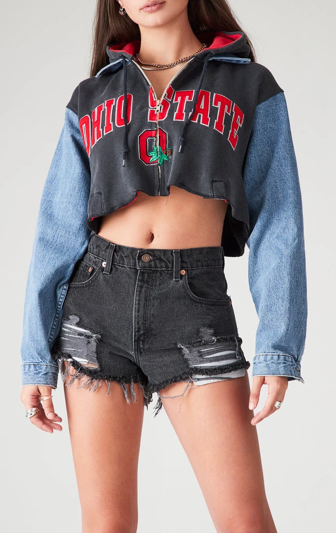 Furst of a Kind reworked this denim jacket, splicing it together with a vintage Ohio State University hooded sweatshirt. Complete with denim collar and zipper closure.