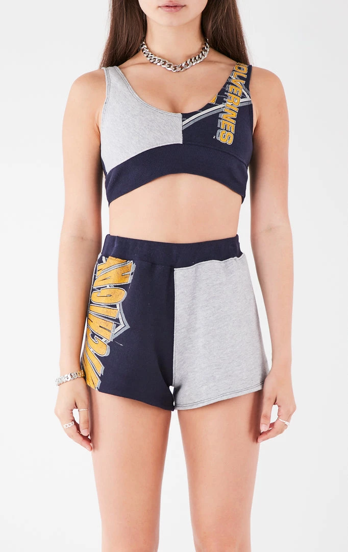 Furst of a Kind took two vintage pullover sweatshirts and spliced them together into this one-of-a-kind tank and short set. This vintage University of Michigan set is sustainable and fashionable.