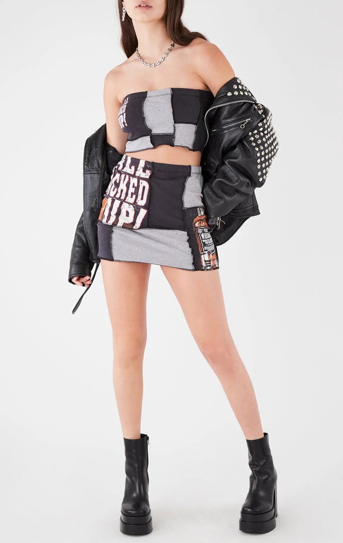 This one-of-a-kind set was crafted from vintage Jack Daniels tee pieces sourced all over the USA. Furst of a Kind reworked them and spliced them together creating a two-piece set with a fit to flatter.