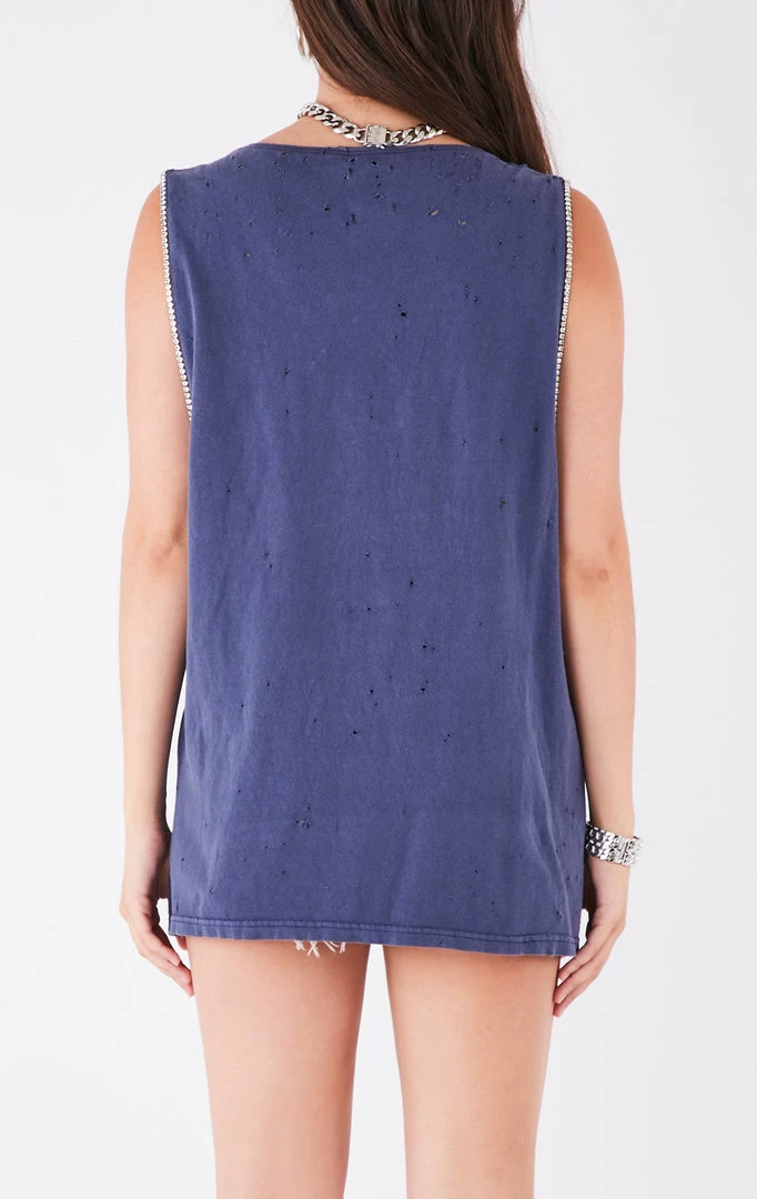This vintage New York Yankees tee was sourced and reworked in Los Angeles by Furst of a Kind. Features a dramatic sleeveless cut and deep v with criss cross rhinestone trim.