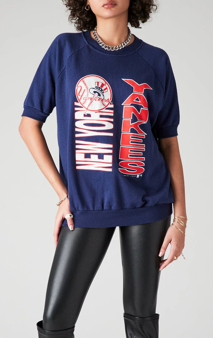For the days when you wanna be comfy & cute, but also keep it cool. This reworked one of a kind vintage New York Yankees sweatshirt is the perfect piece. You can never have enough oversized sweatshirts, but the cut-off short sleeves add a fresh new element to your collection. You’ll get that worn in vintage feel and comfort without all the heat.