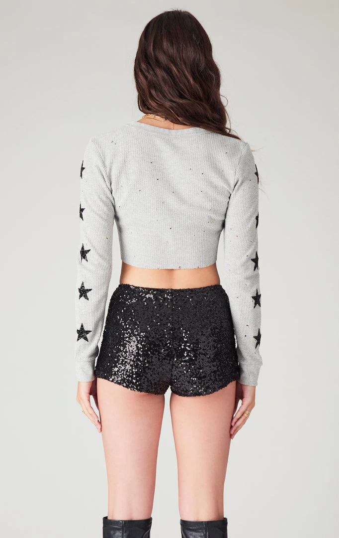 One of a kind vintage long sleeve stonewashed cropped thermal. This style features black rhinestone star patches down both sleeves and has been stonewashed for a perfectly worn-in and effortlessly distressed look.