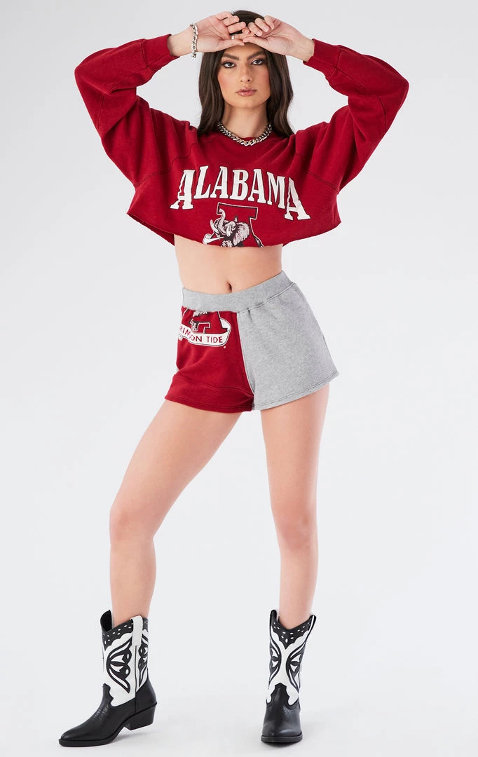 This one-of-a-kind set was reworked by Furst of a Kind from a vintage University of Alabama sweatshirt. Redesigned into a two piece set featuring a cropped sweatshirt paired with a spliced sweatshirt short.Â