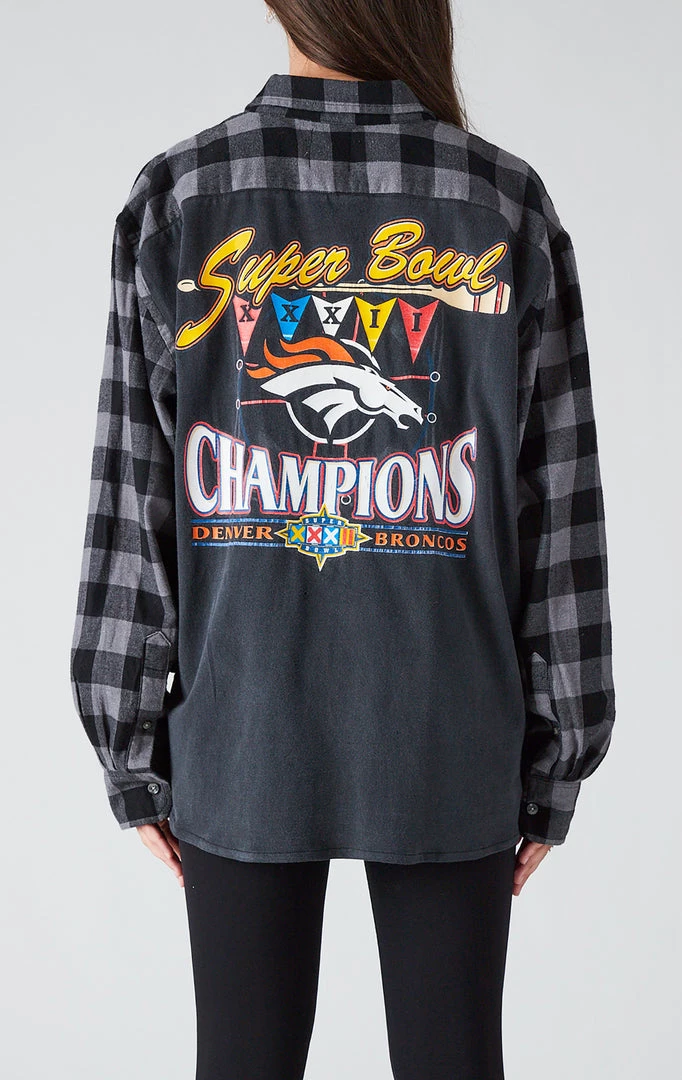 Hate to see you go, but love to watch you leave. It’s all about the back detail on this one of a kind vintage flannel. Furst of a Kind added a vintage Denver Broncos tee on the back of a plaid top and we are officially obsessed.