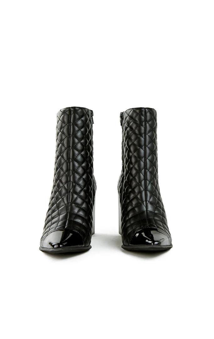 Ziren-Q Quilted Ankle Boot by Jeffrey Campbell. This ankle boot features a 3.5″ block heel, pointed toe, side zip closure, and quilted detailing.