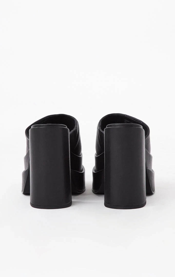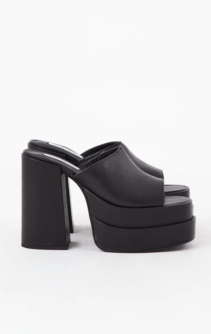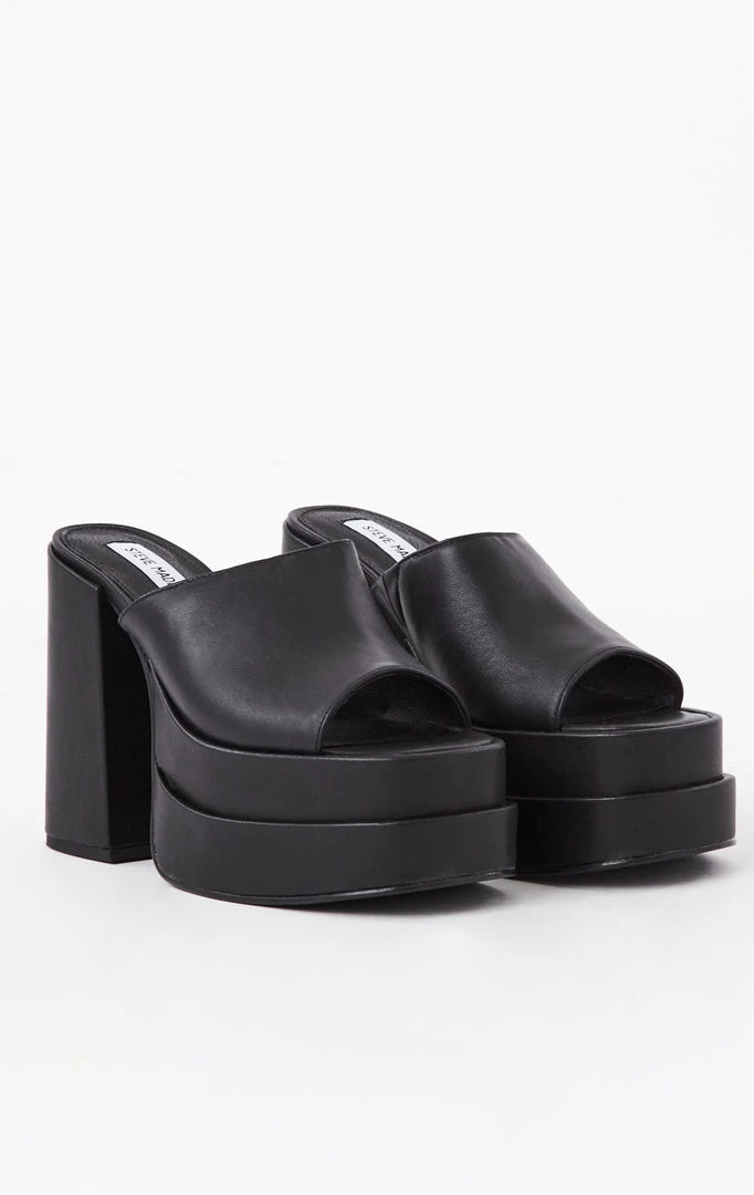 Cagey Platform Sandal in Black Leather by Steve Madden. Features a double soled platform, a 5.25″ heel and 2.25″ platform. Fits true to size.