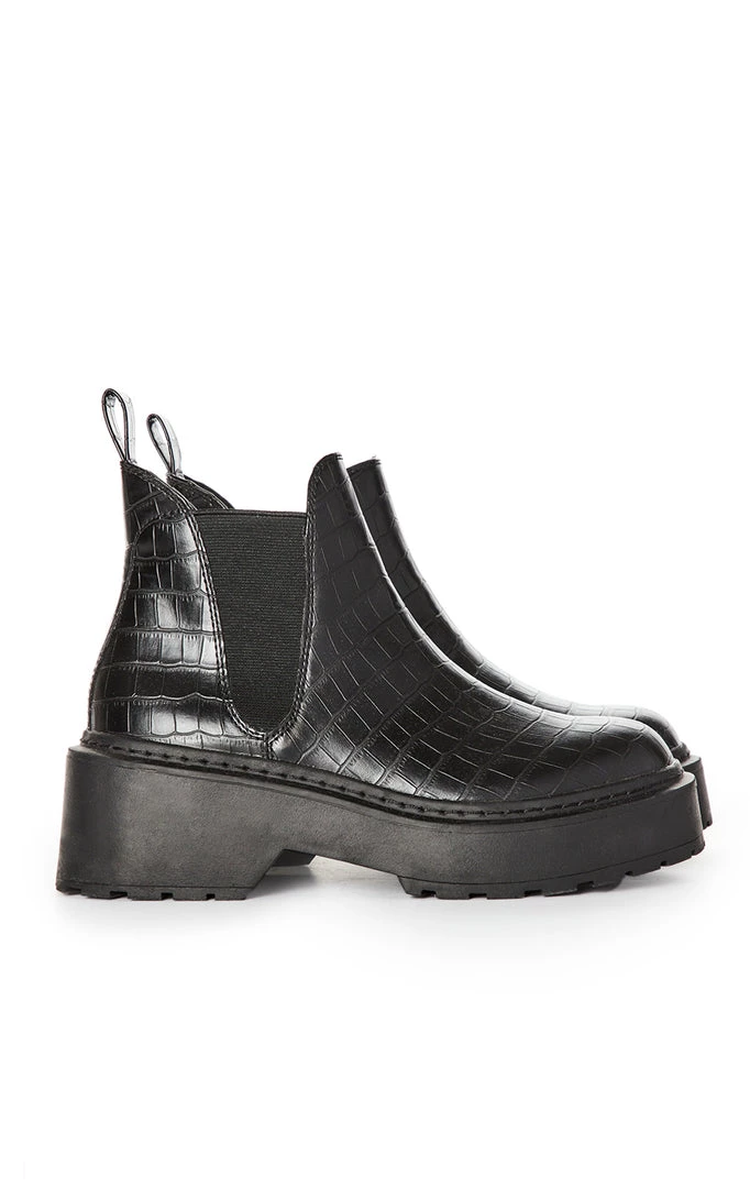 Steve Madden Shadow Crocodile Chelsea Boot in Black. The black embossed crocodile elevates this elastic pull on style, making the Shadow your go-to boot this season.